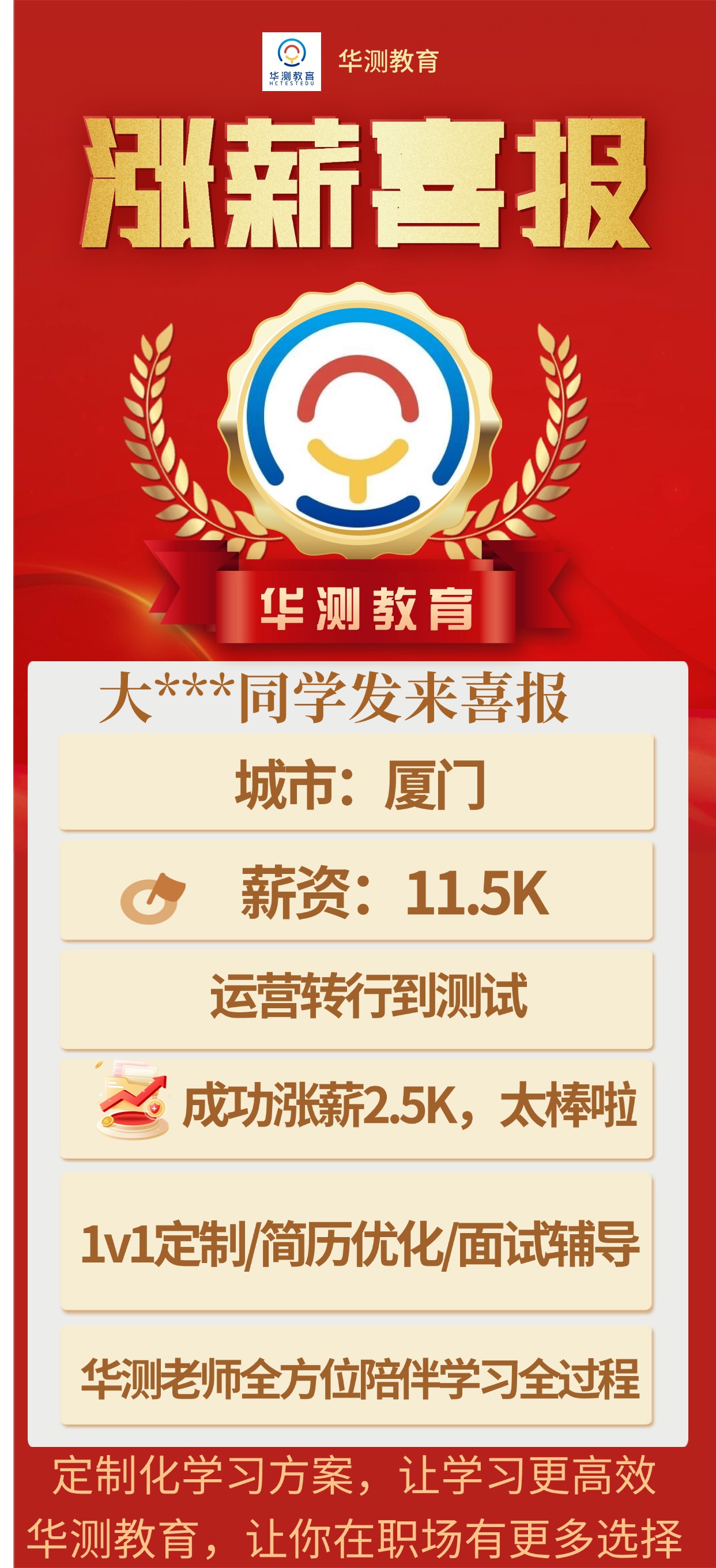 【华测喜报】厦门 11.5K 涨薪:2.5K 运营岗位成功转行到测试